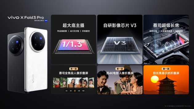 vivo X Fold3系列全面拉齐X100系列影像实力,再次将折叠屏的影像实力提升至行业巅峰。vivo X Fold3 Pro搭载了蔡司全焦段专业影像系统,包括采用了蔡司T*镀膜技术的超感光VCS仿生大底主摄、蔡司超级长焦和超视野超广角摄像头,完美再现vivo X100 Pro的长焦悬日、长焦微距等典型场景,还支持24mm、35mm、50mm、85mm和100mm五大人像黄金点位的蔡司全焦段人像大师,配合全新蔡司人像风格滤镜,为用户带来丰富多样且极具质感的影像体验。同时,vivo X Fold3 Pro更搭载了vivo自研的6nm影像芯片V3,实现折叠屏人像视频进入4K时代。