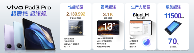 vivo全新一代的超旗舰平板vivo Pad3 Pro也于3月26日发布,产品采用3.1K+144Hz超感巨幕,搭载行业全球首发的天玑9300旗舰芯片,加之蓝晶芯片技术栈联合研发,综合跑分突破两百万大关。配备4低音单元+4高音单元的“超级8扬矩阵”,内置11500mAh超大电池,堪称无死角的旗舰配置,真正诠释安卓超旗舰平板。vivo Pad3 Pro即日起正式开售,起售价为2999元,首销还有额外的权益。